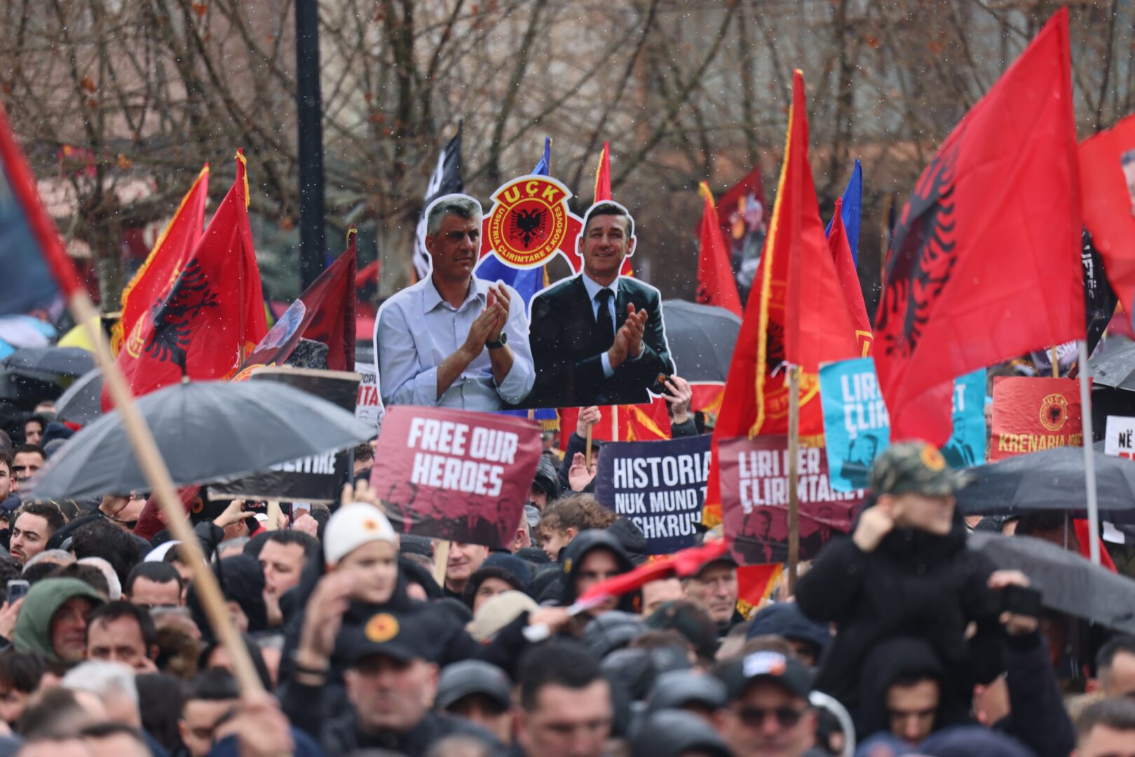 Илјадници луѓе се собраа во Приштина носејќи транспаренти на етничката албанска Ослободителна војска на Косово (ОВК) за да протестираат против судењето на поранешните водачи на ОВК, обвинети за воени злосторства во периодот помеѓу 1998 и 1999 година. Поранешниот претседател Хашим Тачи, поранешните претседатели на парламентот Јакуп Красниќи и Кадри Весели, како и поранешниот пратеник Реџеп Селими беа уапсени во 2020 …