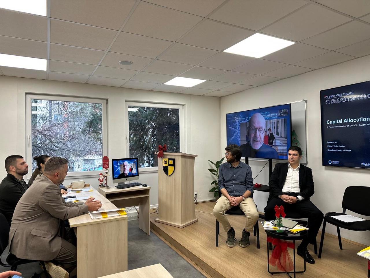 Во рамки на настанот Christmas Talks, на 22 декември, на Факултетот Хајделберг во Скопје, се одржа панел-дискусијата „AI Bubble or AI Double?“, која ги собра водечките експерти од областа на инвестициите, економијата, технологијата и стратегијата, со цел да се отвори суштинска дебата за тоа дали вештачката интелигенција претставува надуен пазарен балон или почеток на нов долгорочен инвестициски циклус.