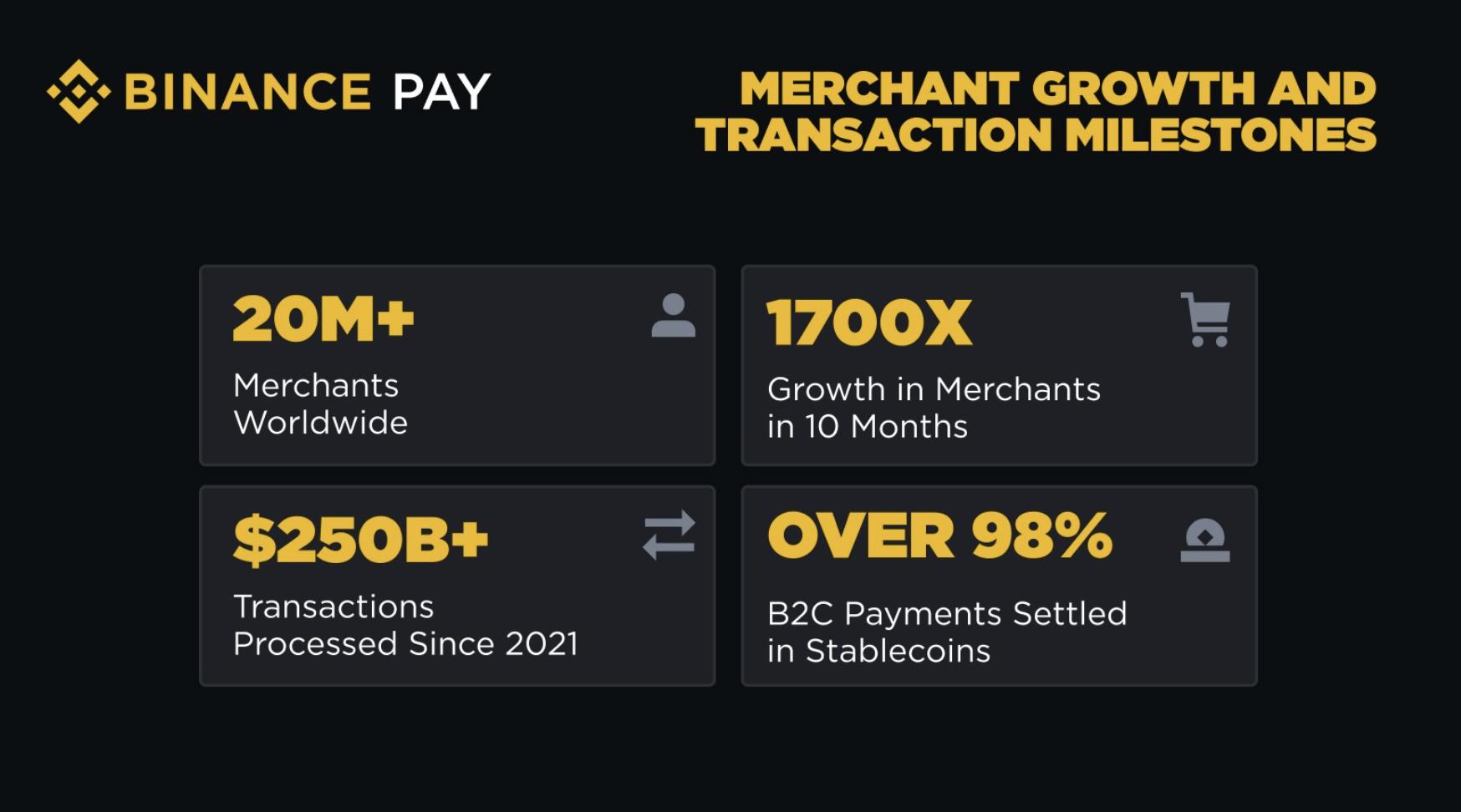 Binance Pay соопшти дека над 20 милиони трговци ширум светот сега прифаќаат плаќања преку платформата, за разлика од почетокот на годината кога имало само 12.000 трговци. Тоа значи дека бројот на трговци во рок од само 10 месеци е зголемен за 1.700 пати. Овој забрзан напредок ја покажува сè поголемата примена на крипто и плаќањата со стабилни коини во секојдневната трговија.