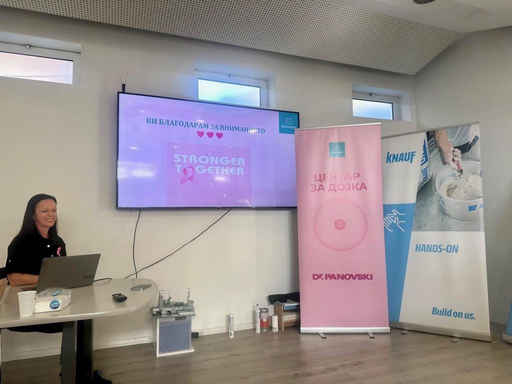 Во тренинг центарот во просториите на Кнауф, предавање одржа д-р Маја Стојановиќ Чрчева од ПЗУ „Центар за дојка“, која зборуваше за важноста на раната дијагностика, самопрегледот и редовните контроли. Преку практични совети и разговор со присутните, таа го истакна значењето на навремената реакција и информираноста како најсигурен начин за зачувување на здравјето.