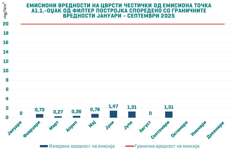 Според податоците за јули – септември 2025, измерените емисии на двете контролни точки се многукратно пониски од пропишаните европски гранични вредности кои изнесуваат 20, односно 30 милиграми на метар кубен.