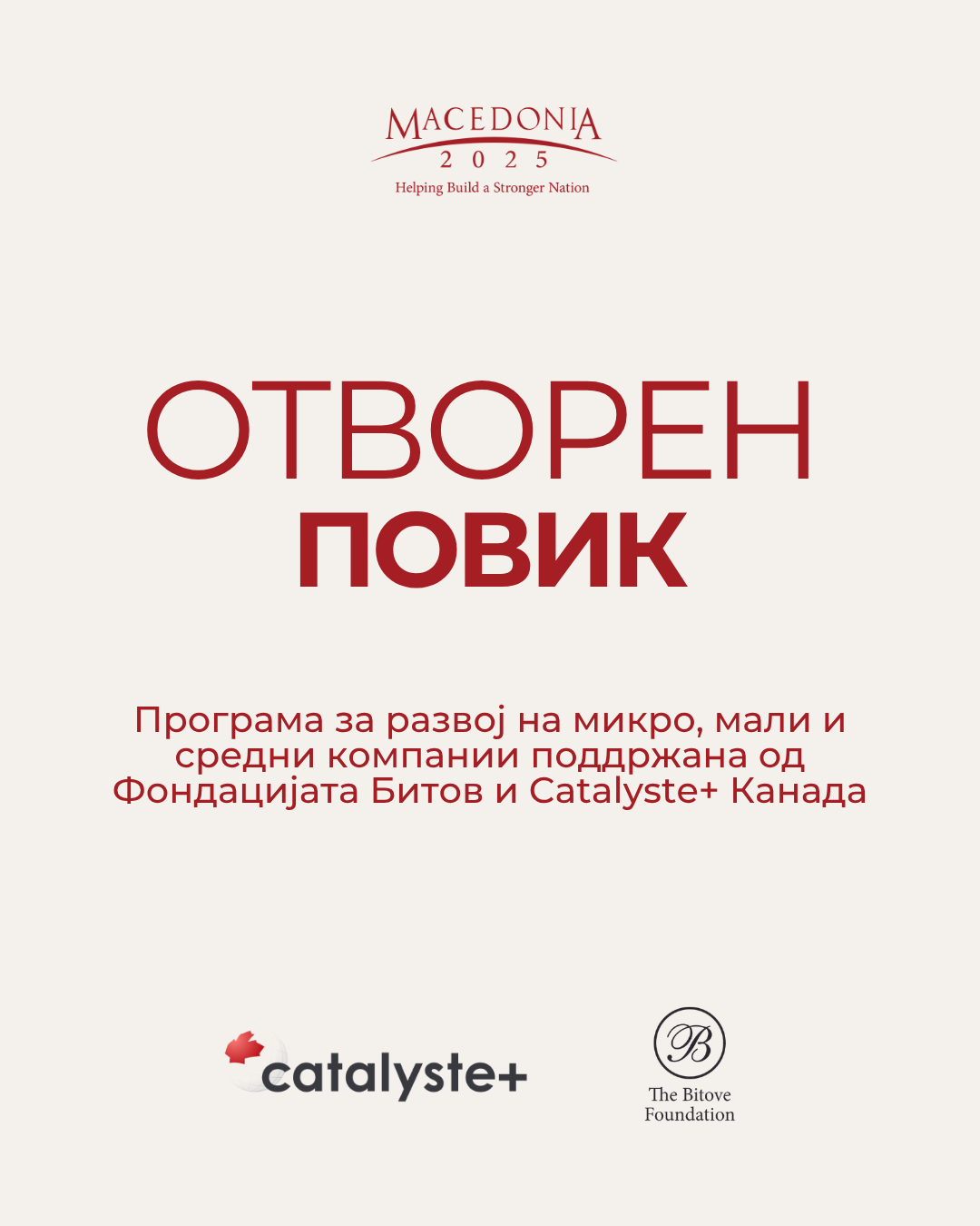 Македонија2025 има заедничка мисија со Catalyste+ да влијае на подобрување и зајакување на конкурентноста на македонските компании и ја спроведува оваа програма во Македонија од 2018 година. Досега, преку оваа програма се поддржани над 30 македонски компании. Советниците на Catalyste+, кои се професионалци со богати професионални кариери, ќе ја донесат својата експертиза директно во Македонија, и ќе работат на конкретни предизвици со кои се соочуваат македонските компании, согласно нивните барања и потреби.