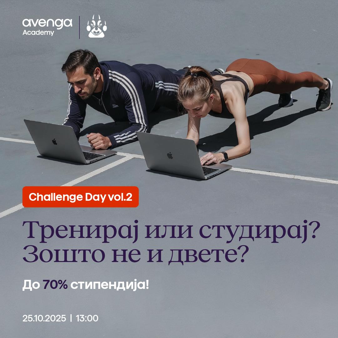 – Avenga Academy (поранешен Сивус Едукативен и Развоен Центар) го организира второто издание на традиционалниот ден за тестирање за стипендии – „Challenge Day“, кој ќе се одржи на 25.10.2025 (сабота) од 13:00 часот во соработка со Kinetics Fitness Studio, обединувајќи го знаењето, физичката активност и грижата за себе на еден динамичен и инспиративен настан.