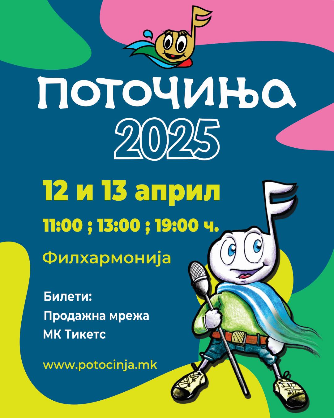 На 12 и 13 април во Филхармонија по 22. пат на големата сцена ќе блеснат единствените „Поточиња“ и ќе ја донесат омилената детска музичка приказна на сите генерации. Со многу љубов и внимание подготвивме нови песни кои со нетрпение чекаме да Ви ги отпееме, а фантастичниот Поки (актерот Мартин Јорданоски) е задолжен за атмосферата на фестивалските денови да биде на највисоко ниво. Затоа, Ве каниме сите заедно да играме, да пееме, да се смееме, да се радуваме и да се забавуваме!