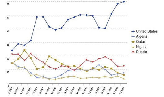 Увоз на течен природен гас во ЕУ од главните партнери во % (извор: Eurostat)